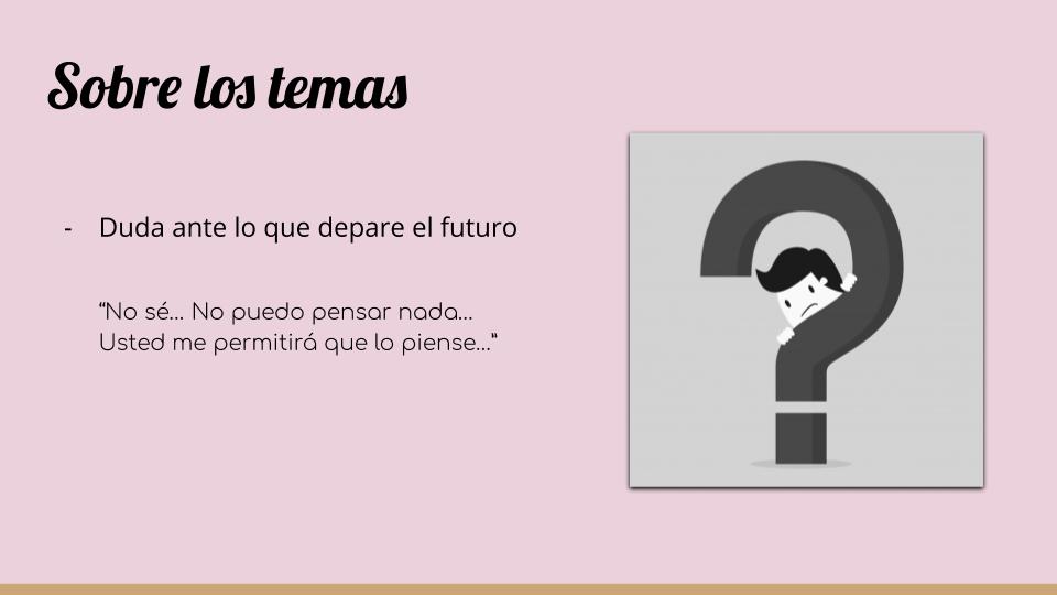 -La incertidumbre de los destinos humanos. Alicia, la protagonista, está dudosa sobre si aceptar o no la propuesta de matrimonio de su jefe (“— No sé… No puedo pensar nada… Usted me permitirá que lo piense… Tengo, tengo que consultar con mi madre…”).