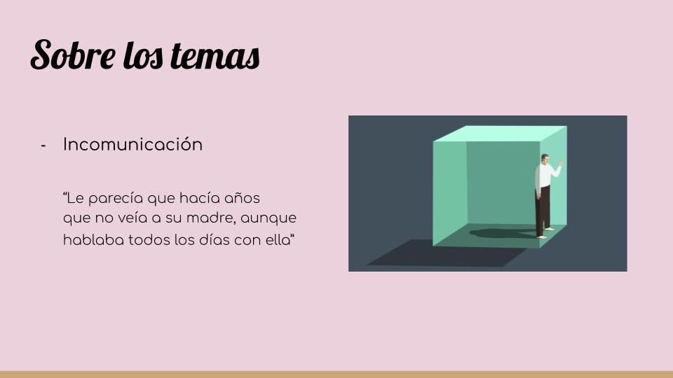 -Otro de los temas destacados es la incomunicación o dificultad para la comunicación, que provoca el aislamiento de los individuos. Ello se aprecia puesto que, en este caso, Alicia no tiene una relación muy abierta con su madre, le cuesta contarle las cosas… (“Hizo un gesto de contrariedad porque no quería encontrar en seguida a la madre”, o “le parecía que hacía años que no veía a su madre, aunque todos los días y hablaba con ella”).