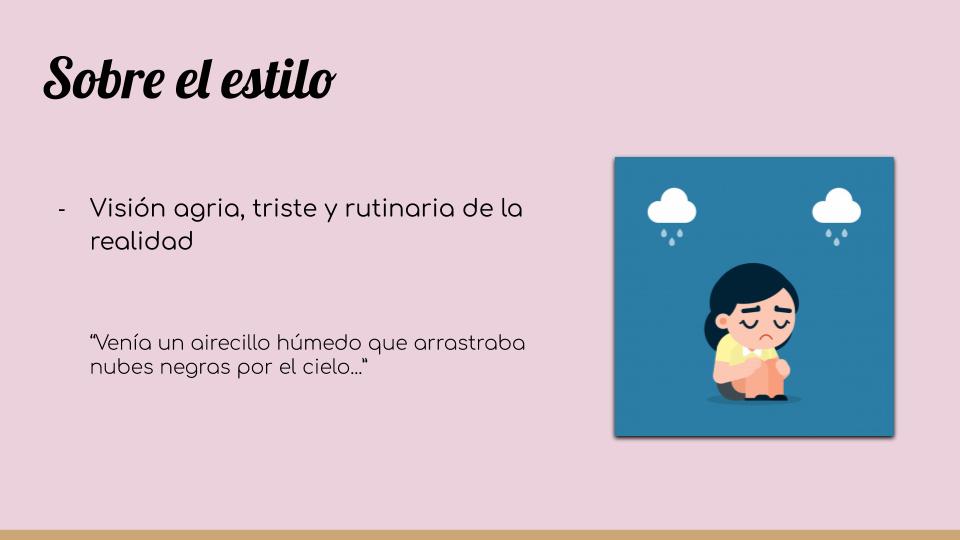 En cuanto al estilo, se emplea un lenguaje funcional, con predominio del registro coloquial. Hay una visión agria de la realidad. Se refleja sobre todo en las descripciones de lugares (“un cielo gris con nubes negras y alguna tímida estrella, brillaba sobre la callecita antigua.”, o “venía un airecillo húmedo que arrastraba nubes negras por el cielo…”).